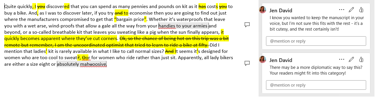 I made some minor changes directly in the text, highlighted in yellow on this example. This ensured that the punctuation was accurate and the voice and approach was consistent with the rest of the book. I also made some more substantial changes at sentence level, to improve the readability.